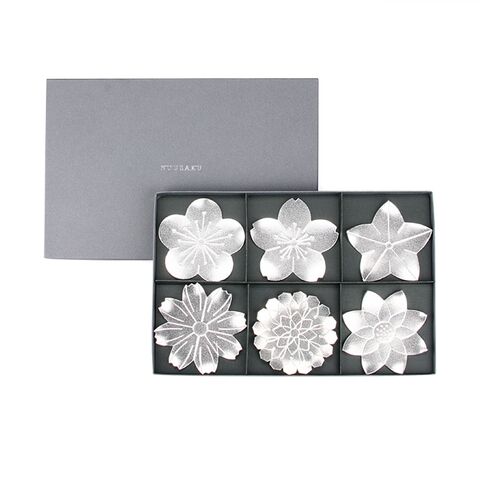 梅・桜・桔梗・コスモス・蓮・ダリアの6種類の花をモチーフにしたトレーのセットです。