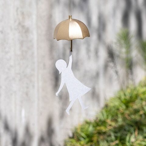 傘を高く掲げて持っているような女の子の短冊が揺れると、雨が降っているのを楽しんでいるかのようです。また、真鍮ならではのリーンと涼やかな音色が、雨の日のじめじめした感じを爽やかな気分に変えてくれますよ。