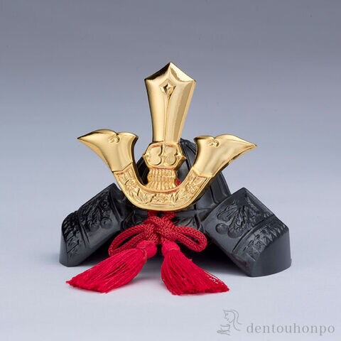 金属製の本格派の兜。小さいながらも重厚かつ精巧な仕上がりとなっております。