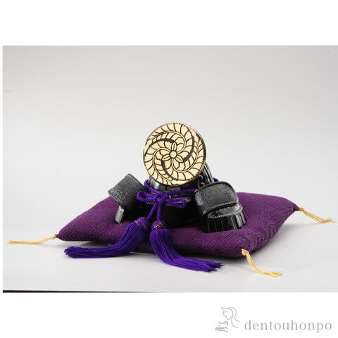 戦において華美な兜は権力や存在の表れとされていました。武将たちの勇猛果敢な志を感じさせる逸品です。前立ては黒田家の家紋「藤巴」を配したシンプルな意匠です。