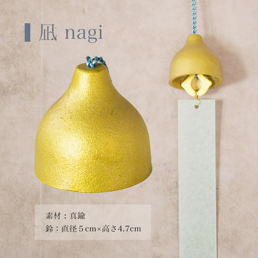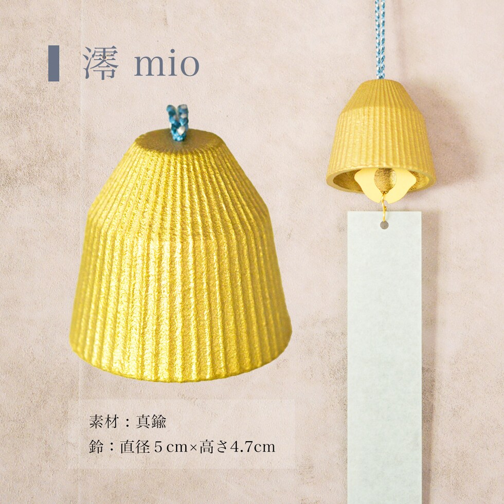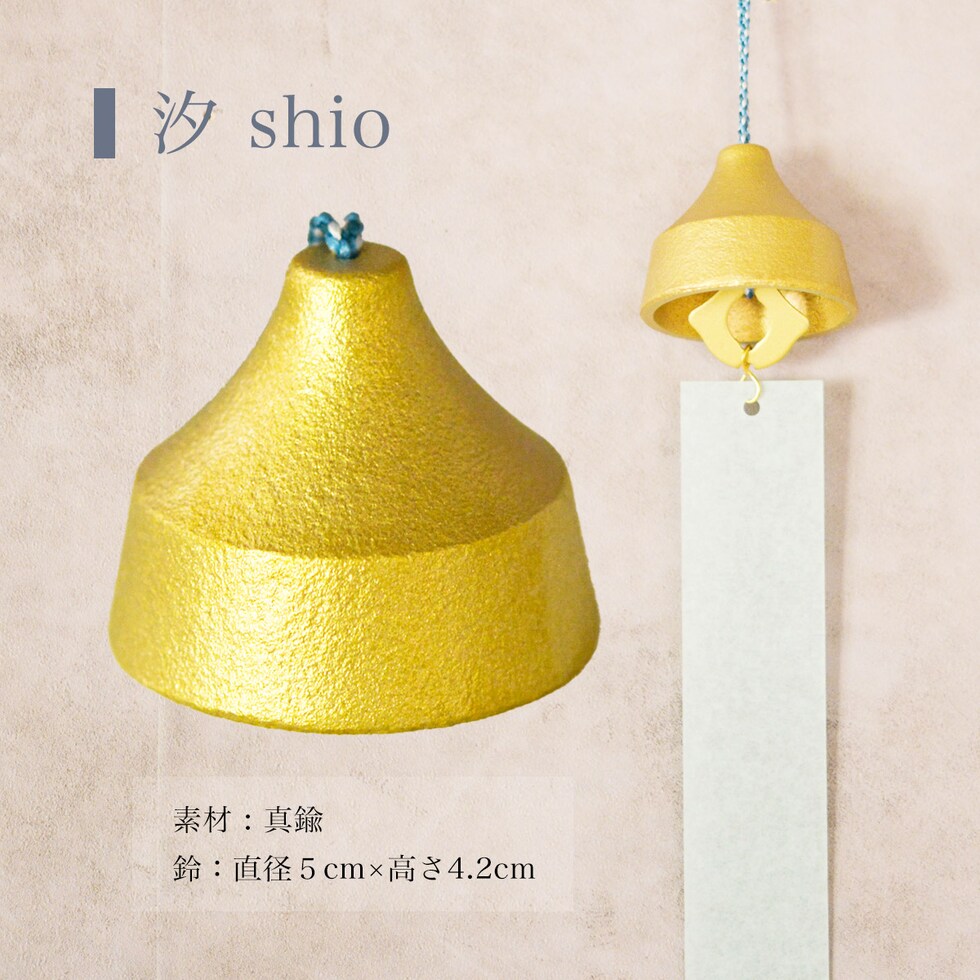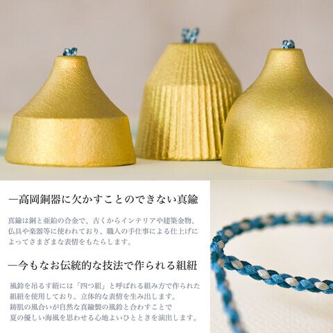 素材の特性や魅力ととことん向き合い誕生した、高岡銅器の真鍮風鈴。富山の海と潮風に着想を得たデザインは、鋳肌の風合いを優しく受け止め真鍮の美しさを際立たせており、真鍮ならではの伸びやかで清涼感あふれる音色を奏でます。また、風鈴をつるす紐は今もなお伝統的な技法で作られている組紐を使用しております。