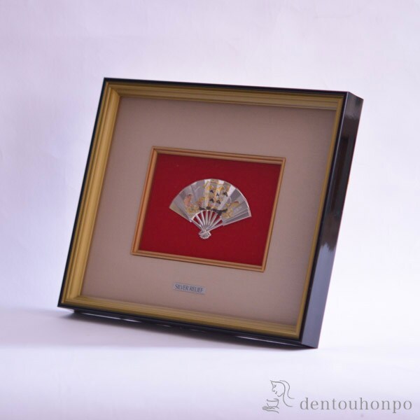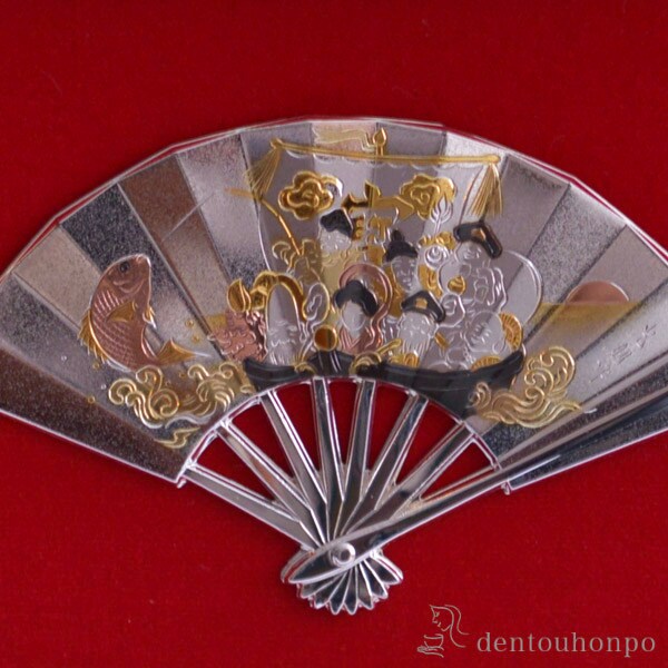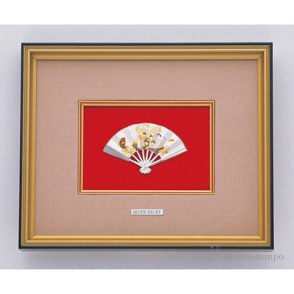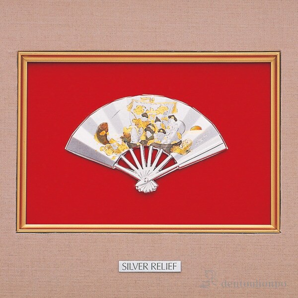 純銀製の扇子をモチーフにした「扇子額」レリーフです。扇子はその優美な形と「末広がり」の意味を持つことから発展・繁栄を表す吉祥文様として古くから好まれています。扇面にはこれも吉祥文様の七福神が乗った「宝船」が描かれています。