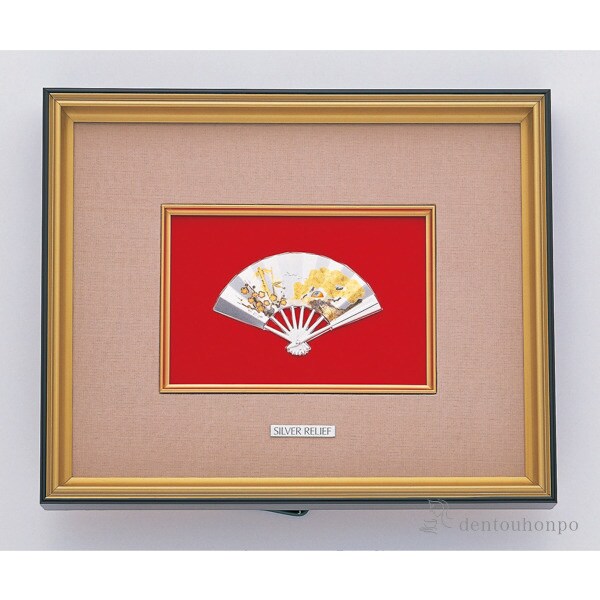 純銀製の扇子をモチーフにした「扇子額」レリーフです。扇子はその優美な形と「末広がり」の意味を持つことから発展・繁栄を表す吉祥文様として古くから好まれています。扇面にはこれも吉祥文様の「松竹梅」が描かれています。