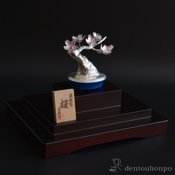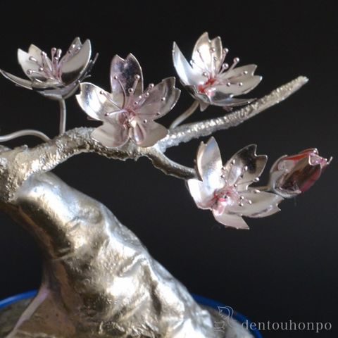 桜の盆栽をモチーフにした銀の飾り置物です。