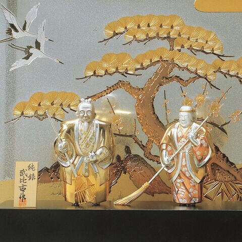 東京銀器の職人技が光る銀製の高砂人形は、夫婦円満と長寿を願う格調高い逸品です。金銀で彩られた松と鶴が精緻に表現され、人生の節目を祝う贈り物やご自宅の象徴として、永く心に寄り添う輝きを放ちます。