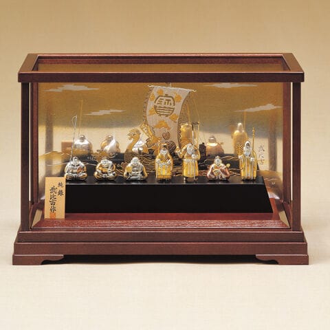 東京銀器の伝統技術が光る純銀製七福神。金銀細工の宝船と七福神が緻密に再現され、福を招く縁起物として空間を格調高く飾ります。贈り物やご自宅の飾り物に最適。専用の木製ケース付きです。