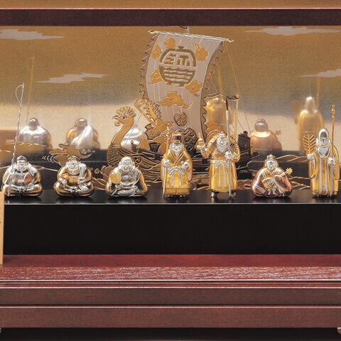 東京銀器の伝統技術が光る純銀製七福神。金銀細工の宝船と七福神が緻密に再現され、福を招く縁起物として空間を格調高く飾ります。贈り物やご自宅の飾り物に最適。専用の木製ケース付きです。