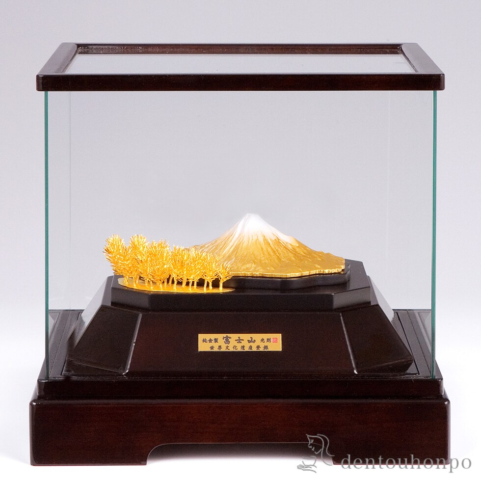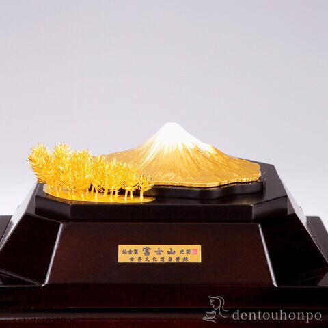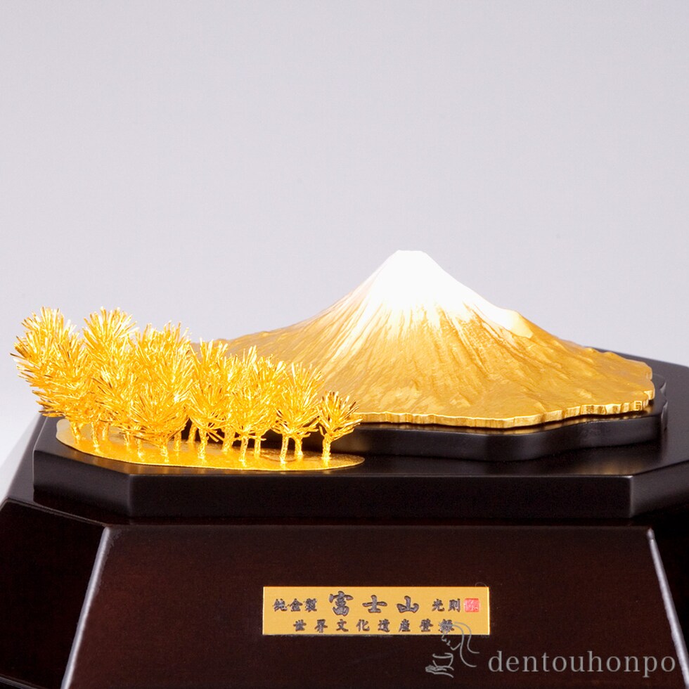 日本の伝統工芸「東京銀器」の職人による縁起の良い純金置物。豊かな伝統と職人の技が息づいています。富士山の優美な姿と純金の輝きは目を奪う美しさです。ご家宝として代々受け継ぐ価値ある存在。贈り物としてもおすすめで、お祝いや記念品など様々な場面でお喜びいただけます。