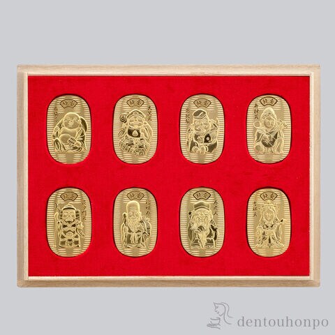 八福神の純金製小判セット。11gの小判が8枚セットになっております。美しく装飾された8枚の小判は、お守りとしても頼もしい存在。ご家宝として代々受け継ぐ価値ある存在です。贈り物としても最適で、特別な日のお祝いや感謝の気持ちを伝えるのにふさわしい逸品です。