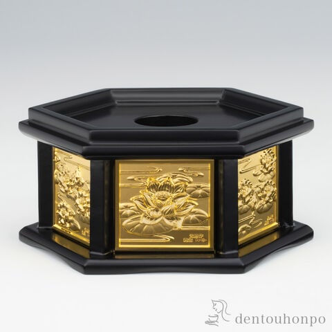 純金の飾りが付いた「りん台」です。※おりん・りん棒等は付属しません。六角形の6面に純金の飾りが付いており、よりお仏壇を美しく演出します。