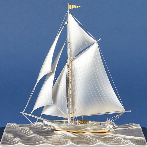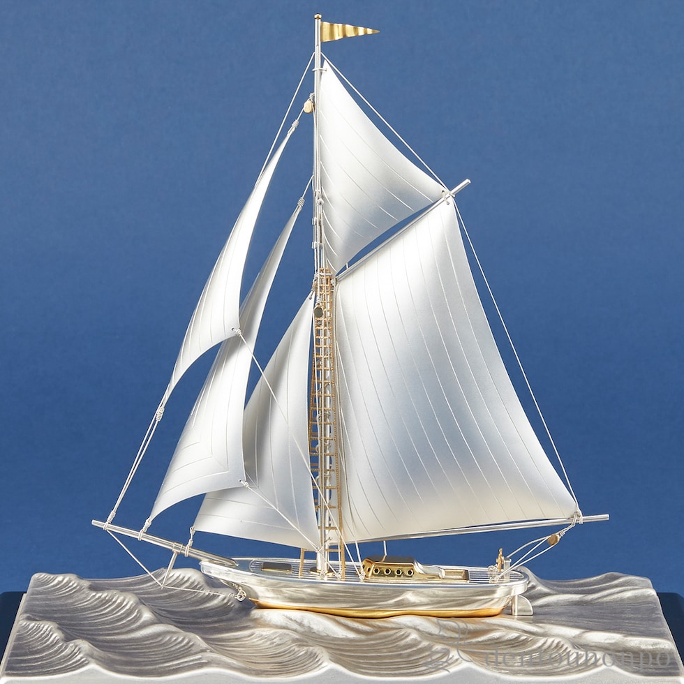 洗練された輝きを放つ銀製のヨット置物。優雅な曲線と重厚感が空間に高級感を添え、成功や前進の象徴として、昇進祝いや業務提携・契約締結など新たなパートナーシップを祝う贈り物・記念品などに最適です。
