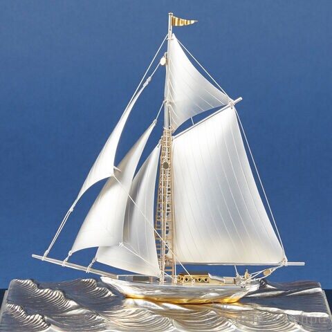 洗練された輝きを放つ銀製のヨット置物。優雅な曲線と重厚感が空間に高級感を添え、成功や前進の象徴として、昇進祝いや業務提携・契約締結など新たなパートナーシップを祝う贈り物・記念品などに最適です。
