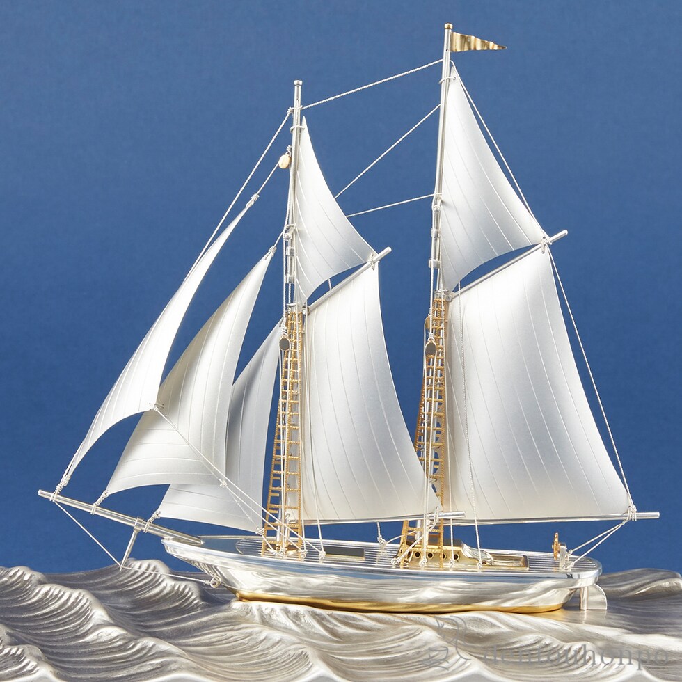 洗練された輝きを放つ銀製のヨット置物。優雅な曲線と重厚感が空間に高級感を添え、成功や前進の象徴として、昇進祝いや業務提携・契約締結など新たなパートナーシップを祝う贈り物・記念品などに最適です。