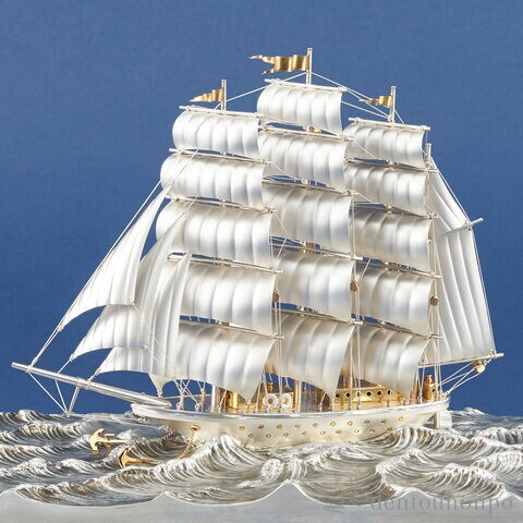 洗練された輝きを放つ銀製の船をかたどった置物です。優雅な曲線と重厚感が空間に高級感を添え、成功や前進の象徴として、昇進祝いや業務提携・契約締結など新たなパートナーシップを祝う贈り物・記念品などに最適です。