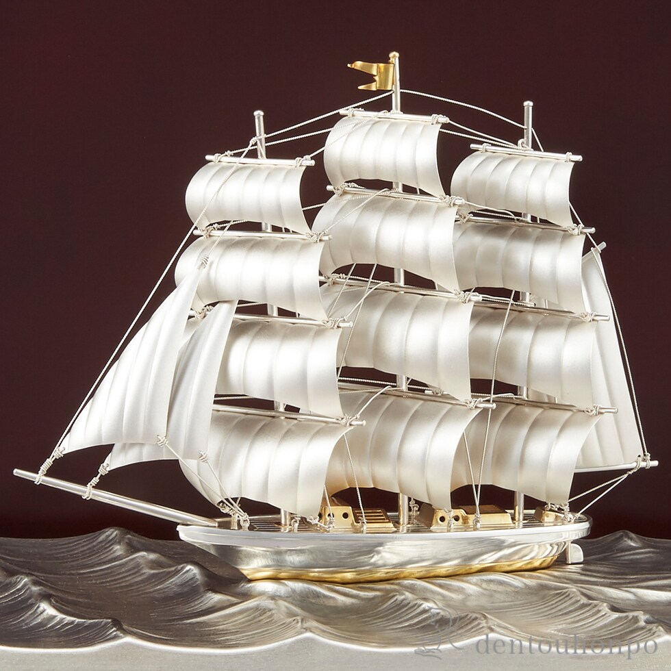 洗練された輝きを放つ銀製の船をかたどった置物です。優雅な曲線と重厚感が空間に高級感を添え、成功や前進の象徴として、昇進祝いや業務提携・契約締結など新たなパートナーシップを祝う贈り物・記念品などに最適です。