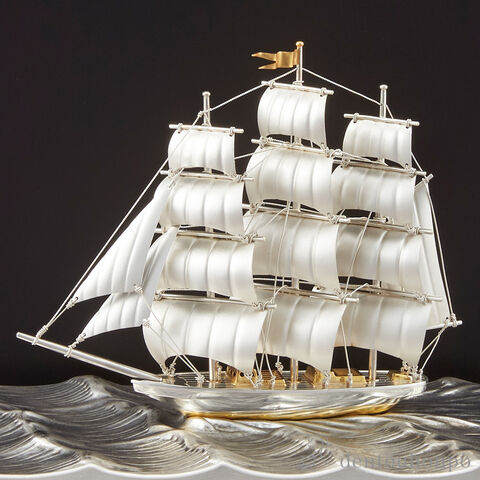 洗練された輝きを放つ銀製の船をかたどった置物です。優雅な曲線と重厚感が空間に高級感を添え、成功や前進の象徴として、昇進祝いや業務提携・契約締結など新たなパートナーシップを祝う贈り物・記念品などに最適です。