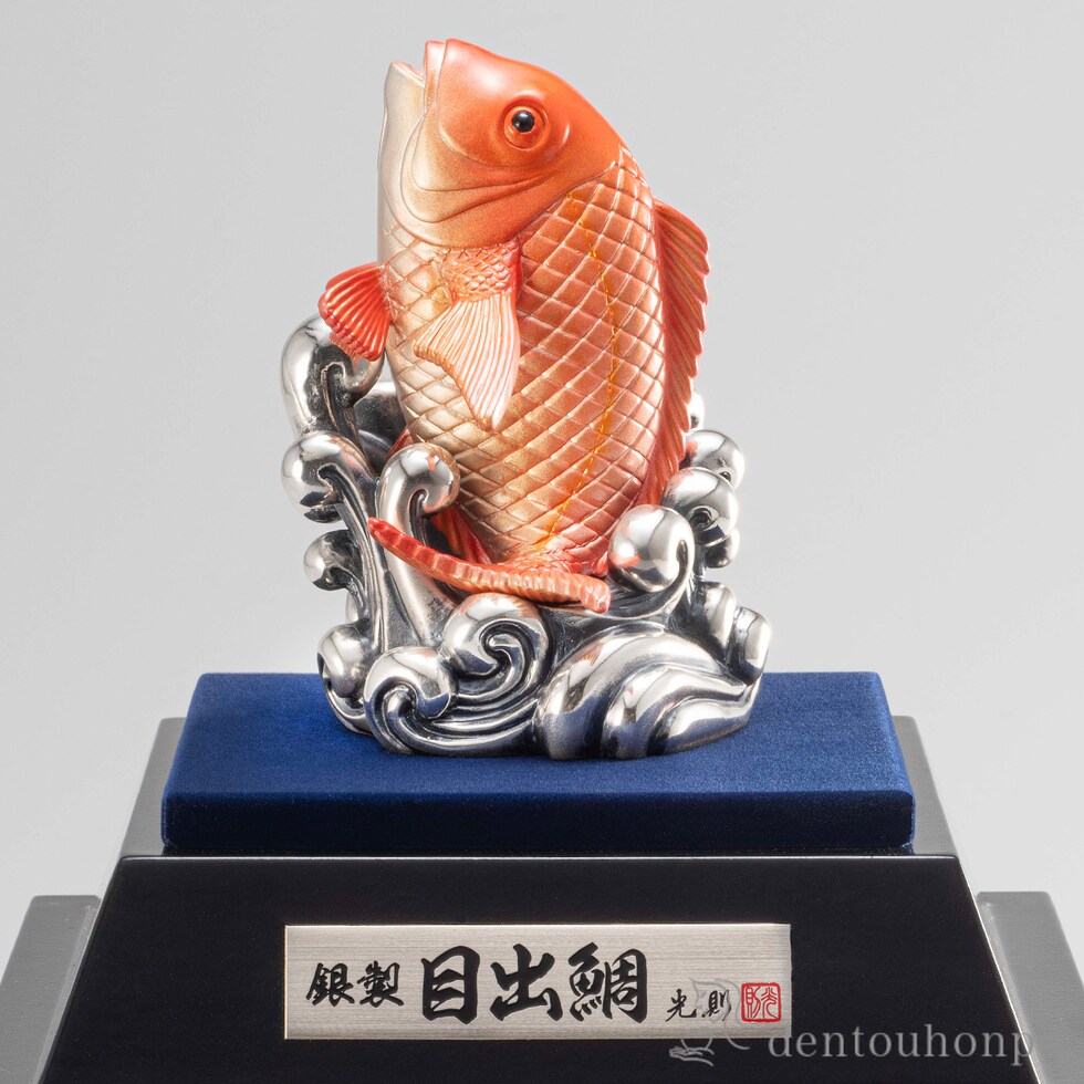 日本の伝統工芸「東京銀器」の職人による、縁起の良い目出鯛をモチーフにした銀製置物。豊かな伝統と職人の技が息づいています。細部にまでこだわった逸品が、心豊かなひとときを演出します。贈り物としてもおすすめで、お祝いや記念品など様々な場面でお喜びいただけます。