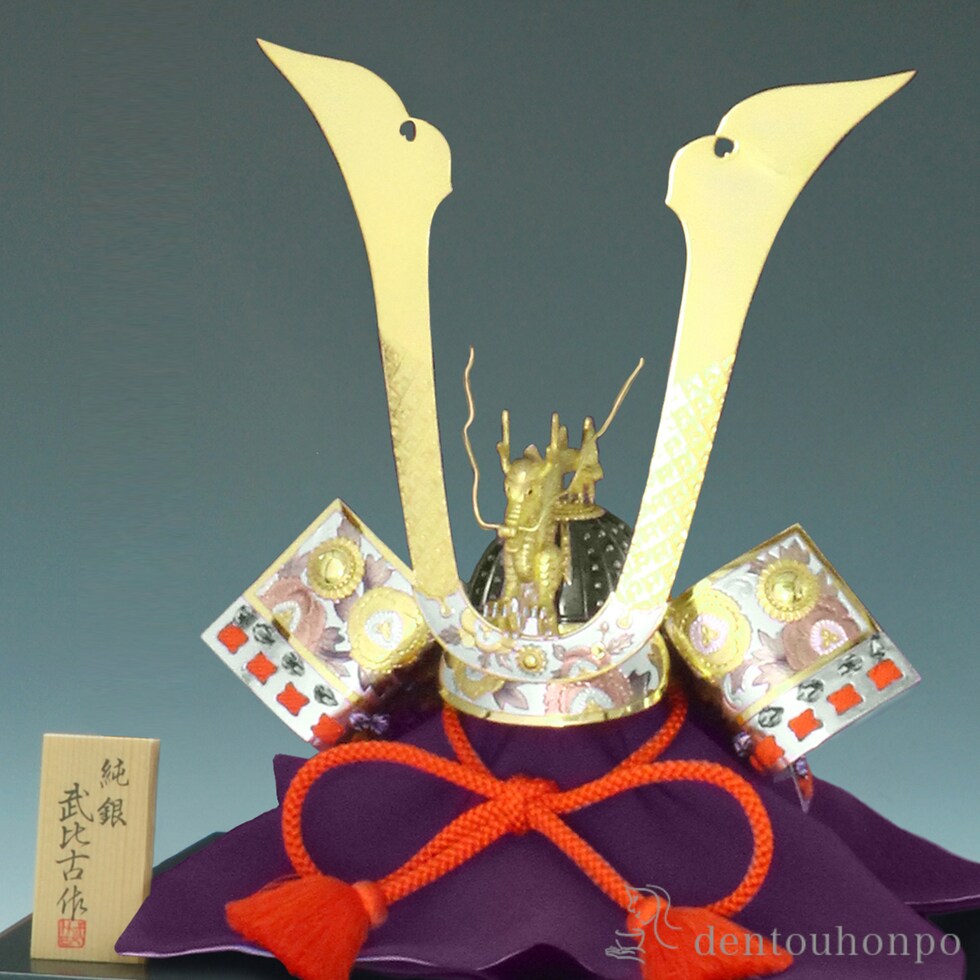純銀で見事に表現した兜です。端午の節句に鎧、兜を飾り、鯉のぼりを立てて、男の子がたくましく成長することを願う習わしは、日本のゆかしい伝統文化です。お子様の光輝く未来を心からお祈りいたします。