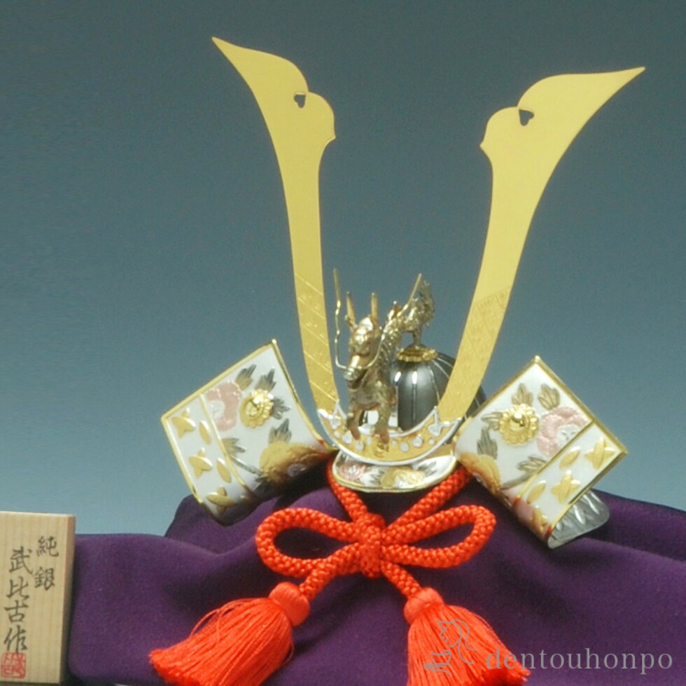 純銀で見事に表現した兜です。端午の節句に鎧、兜を飾り、鯉のぼりを立てて、男の子がたくましく成長することを願う習わしは、日本のゆかしい伝統文化です。お子様の光輝く未来を心からお祈りいたします。