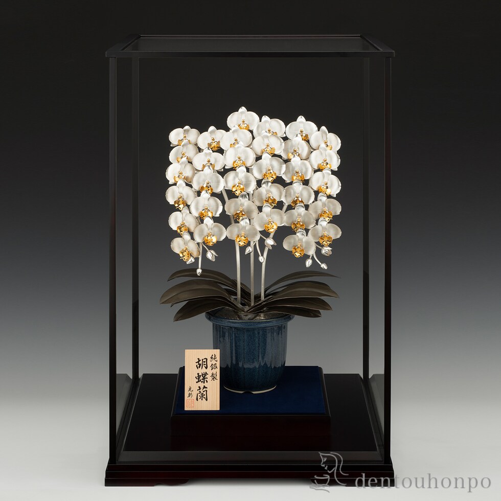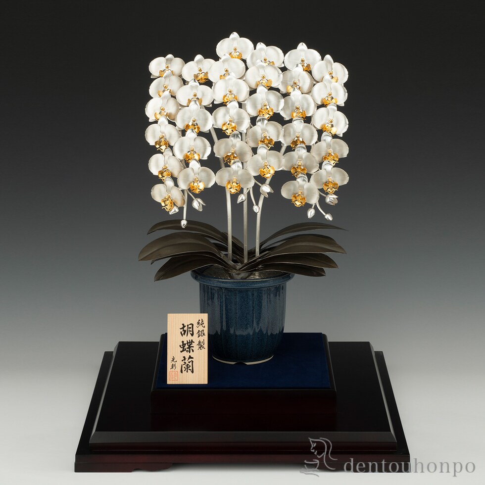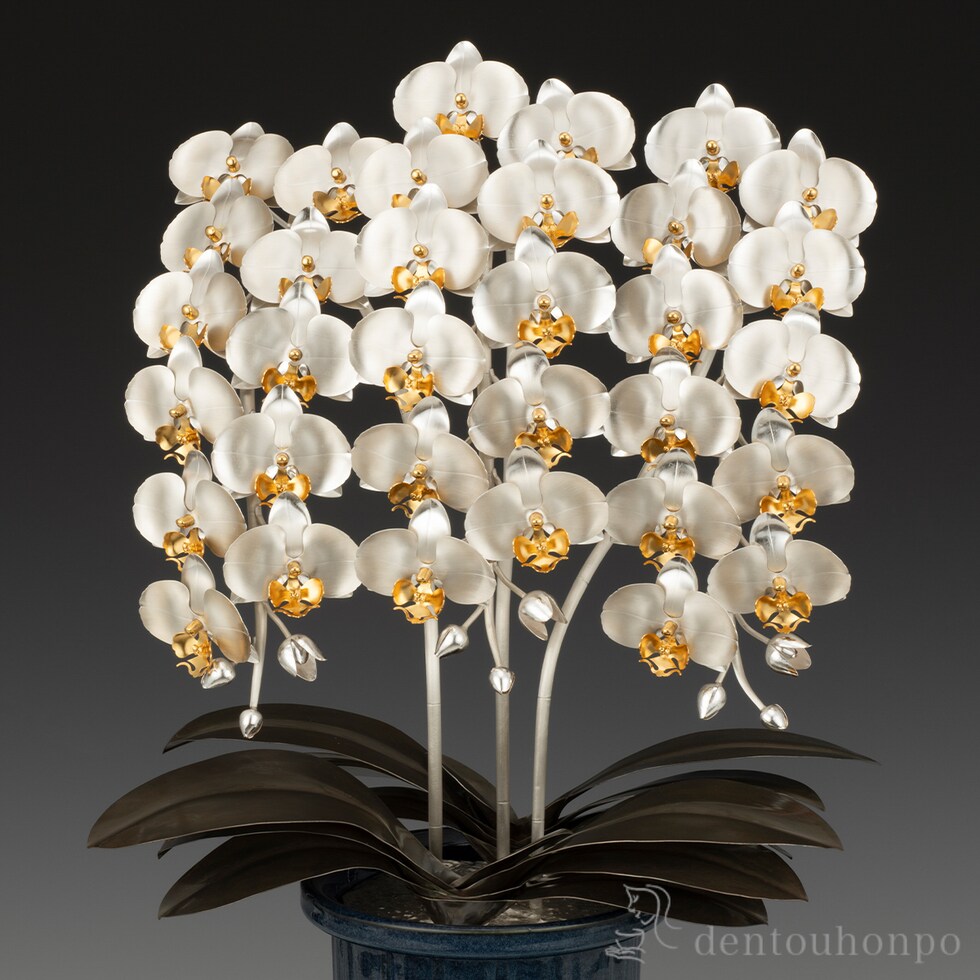 「胡蝶蘭(こちょうらん)」特有の流れるような優雅なラインは、まさに美しい蝶が目の前で舞っているかのようで、見る人を魅了せずにはおきません。この豪華で気品高い胡蝶蘭を、純銀で見事に表現しました。幸福と繁栄の象徴として、開店祝いや創業祝い、周年記念など大切な節目の贈り物に最適です。