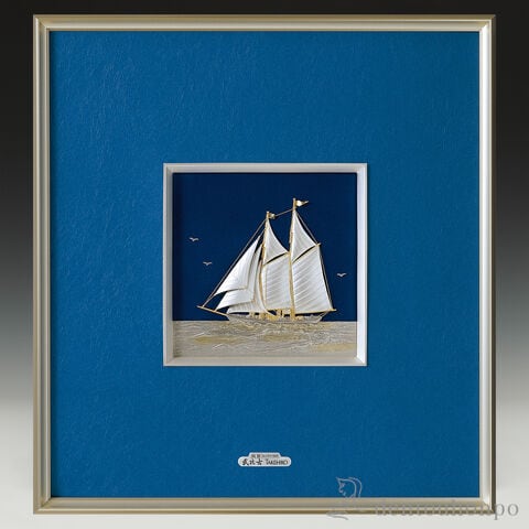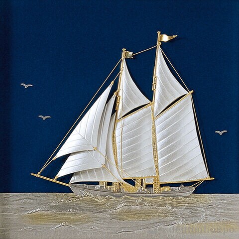 洗練された輝きを放つ銀製のヨットを表現したパネルです。ヨットの優雅な曲線と銀の質感が空間に高級感を添えます。成功や前進の象徴として、昇進祝いや業務提携・契約締結など新たなパートナーシップを祝う贈り物・記念品などに最適です。