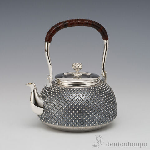茶道具として、欠かすことのできない湯沸かし。スタンダードな霰模様です。細部にいたるまでの精巧な作りはもちろん、純銀の気品ある輝きをご堪能ください。