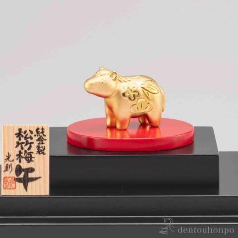 純金製 松竹梅 「午」 K24 10g ガラスケース付き ( 木札名入れ有料 お正月 新年 午 馬 十二支 2026年 開運 東京銀器(金工芸) 結婚 出産 内祝い 引き出物 )