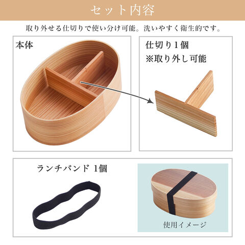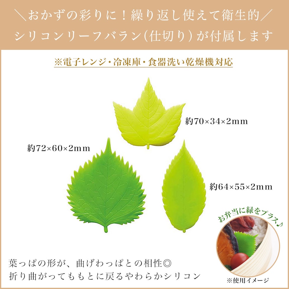 備考:ランチバンド、木製仕切り、シリコンリーフバランが付属します。 電子レンジ(500Wで30秒程度):○、食器洗浄機:○※仕切り・蓋もレンジ・食洗機対応です。