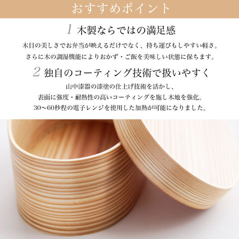 ・ 通常の曲げわっぱお弁当箱と比べて、隙間ができにくい構造を採用し強度・耐熱性の高いコーティングを施した。