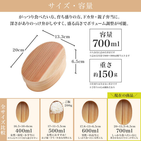 木製 曲げわっぱ 弁当箱 レンジ対応・食洗機対応 700ml 仕切り・ランチバンド・当店限定バラン付き ( レンジ対応 大人 男性 高校生 ドカ弁 わっぱ弁当箱 )