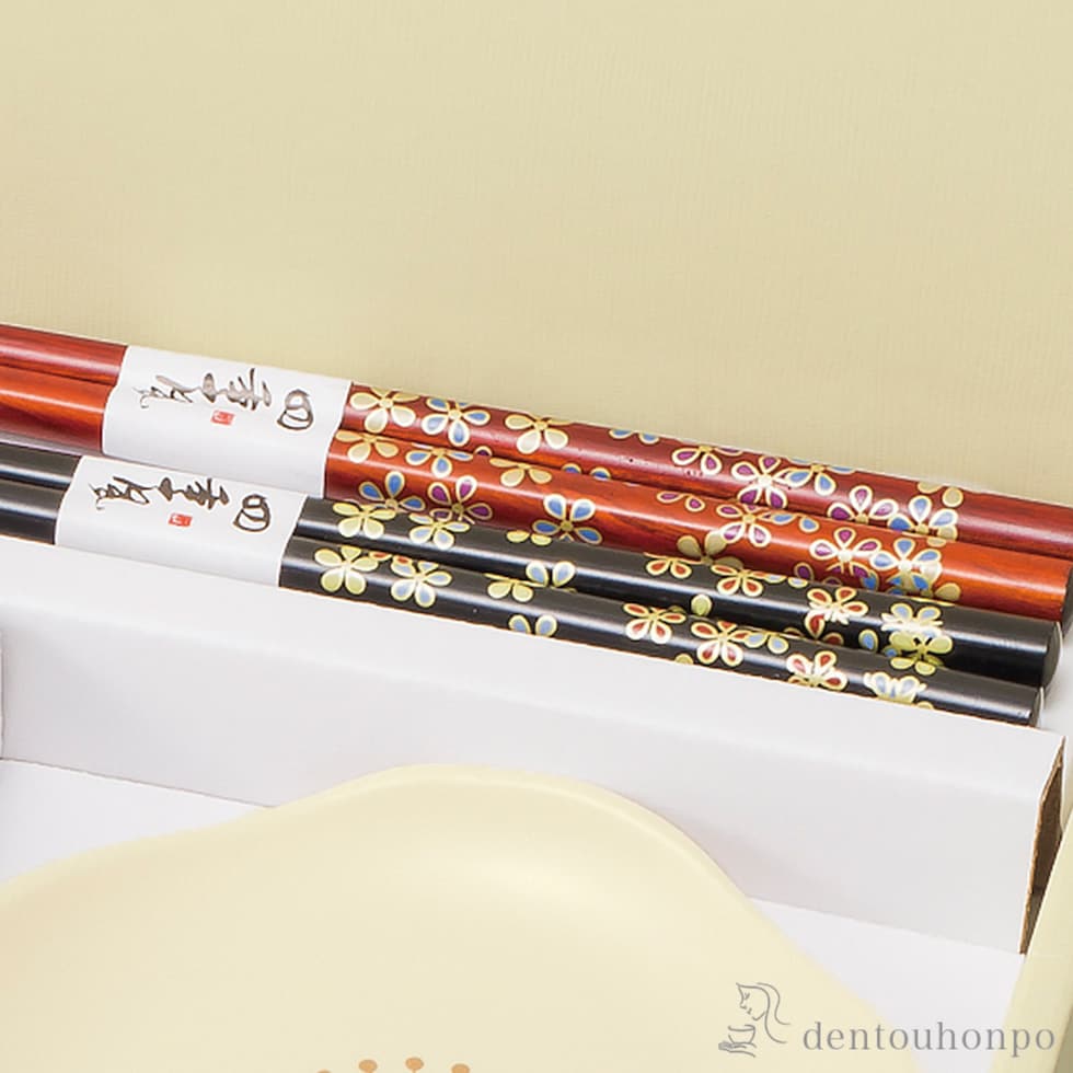 日々使うお箸やお皿を伝統工芸で施した彩を与えるお皿とお箸のセットになっています。