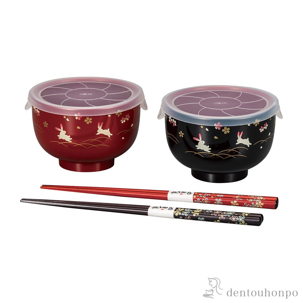材質:[シール蓋] 本体:ポリプロピレン樹脂 [夫婦汁椀] 本体:ポリエチレンテレフタレート、表面:ウレタン塗装 [夫婦箸] 本体:木製・ポリウレタン樹脂