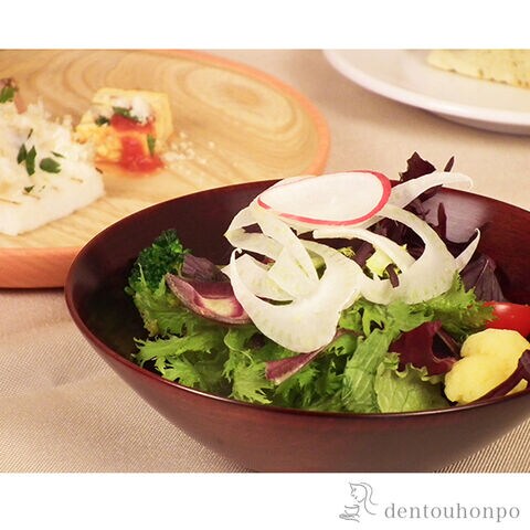 木目を活かした漆塗りで、さりげない上品さが素敵です。薄挽きなのでとても軽く、すっきりしたデザインなので煮物やサラダなどのお料理が引き立つ器です。