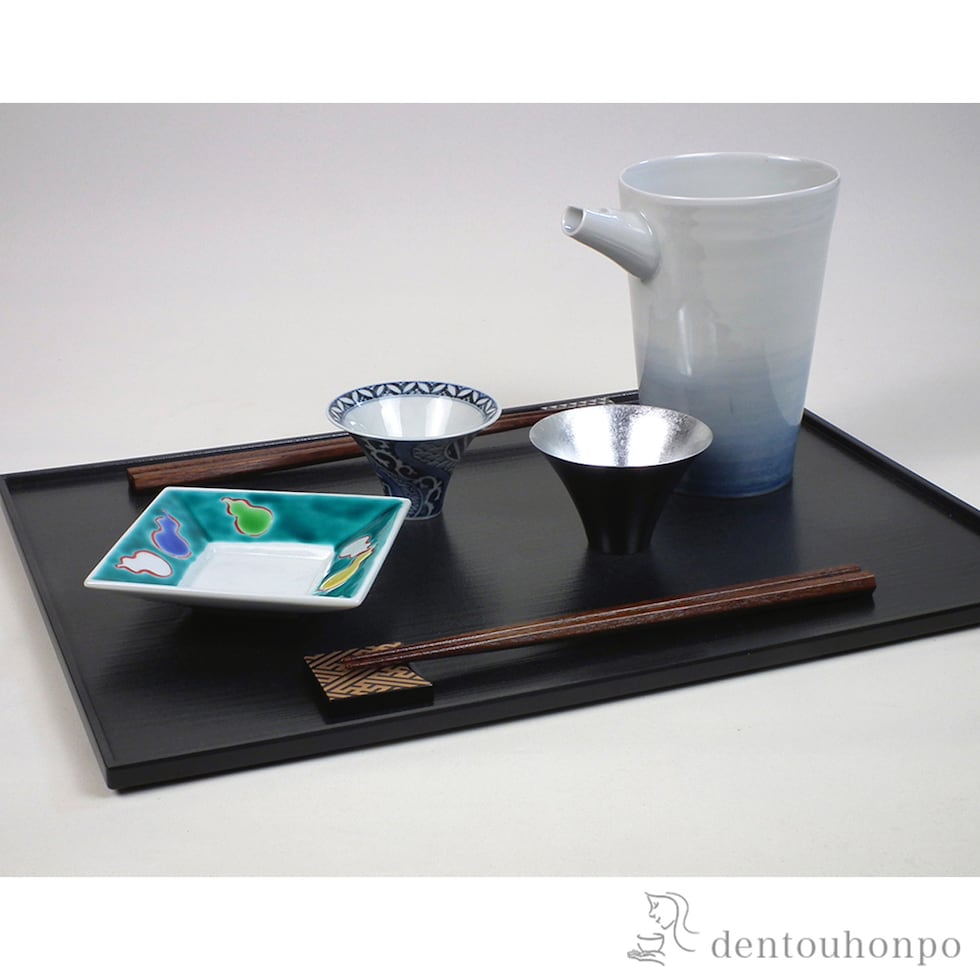 材質:[箸(小)] 本体:天然木、表面:漆塗り [箸(大)] 本体:天然木、表面:漆塗り [箸置き] 本体:合成漆器、表面:ウレタン塗装 [角小鉢] 本体:陶器 [片口] 本体:陶器 [角長盆] 本体:合成漆器、表面:ウレタン塗装