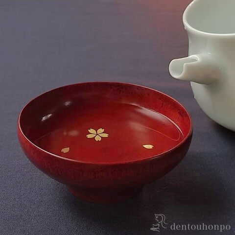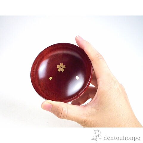 内側に桜を金箔で描いたぐい呑です。持ちやすく、軽い口当たりが特徴です。職人がひとつひとつ丁寧に轆轤(ろくろ)挽きという技法で、木地を薄く挽きあげて作られています。