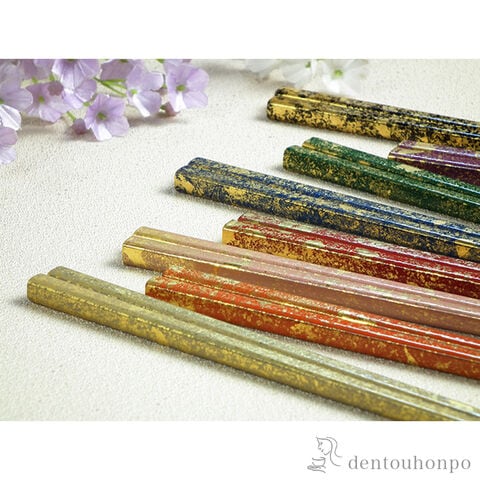 上質な木製漆塗の箸です。形は細角で淡い塗りに金箔を散らしている為、おめでたい席などにも素敵にお使いいただけます。