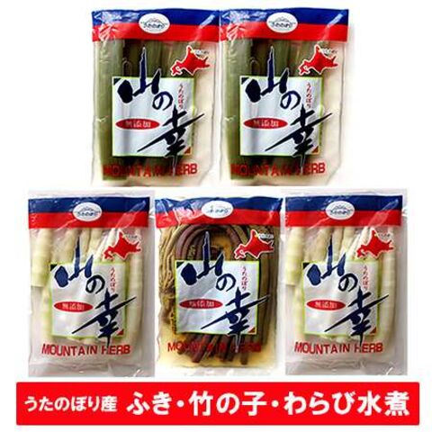 北海道 山菜セット ふき / たけのこ / わらび 山菜 水煮 送料無料 山菜水煮 フキ / 竹の子 / 蕨 みずに 計5袋 歌登 ( うたのぼり ) 水煮野菜 煮物に最適