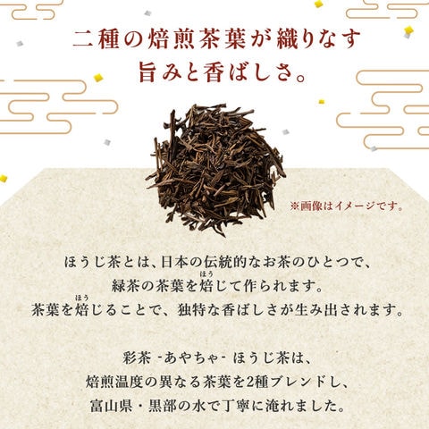 「日常をちょっとおいしく、いつもの日々に彩りを。」をコンセプトに、こだわりのおいしさと リーズナブルな価格で皆さまの毎日を彩る、当社オンラインストア限定ブランド「彩茶 -あやちゃ- 」 「彩茶 -あやちゃ- ほうじ茶」は、焙煎方法や水にこだわり、ほっとする味わいに仕上げたほうじ茶です。 鹿児島県産茶葉本来の旨み際立つ弱火焙煎茶葉と、ほうじ茶独特の焙煎香を引き出す強火焙煎茶葉をブレンドし、 水がおいしいことで知られる富山県・黒部の水で丁寧に淹れました。 飲み切りに丁度いい500mlサイズで、いつでも気軽に新鮮なお茶をお持ち歩きいただけます。 日常はもちろん、もしものときの備蓄やローリングストックとしてもおすすめです。 ペットボトル500ml×24本を1ケースとして、送料無料(沖縄除く)でお届けします。 宅配便で玄関先までお運びしますので、まとめ買いにぜひご利用ください。 ※複数購入いただいた場合、1箱単位での配送となり荷物が分かれて届く場合がございます。予めご了承ください。 【LIFEDRINKは、株式会社ライフドリンク カンパニーの直販限定ブランドです。】 |