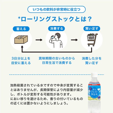 近年、地震や集中豪雨などの災害の増加による、防災意識の高まりや備蓄用飲料水の需要拡大が見られます。 そのような中で、持ち運びや利便性も考慮し、500mlの長期保存水を開発しました。 当社は今後も「おいしさの中心、安心の先頭へ。」の企業理念のもと、 すべての人の"いつも"に寄り添える飲料や商品、サービスを提供するとともに、社会課題の解決に貢献してまいります。 ■『富山きときと保存水』は、ミネラル分を除去した純水を加熱殺菌しています。 そのため、飲用はもちろんのこと、調理用、赤ちゃんのミルクづくり用など、生活の様々な場面でご利用いただけます。 パッケージは、表面上部に一目で備蓄品とわかるよう「長期保存水」と記載し、裏面に災害時にご活用いただけるよう、 災害伝言ダイヤルの利用方法を記載しております。 また、デザインは災害時・非常時こそ心を落ち着かせて欲しいとの願いから、 ラベルの背景に穏やかな富山の春の景色のイラストを採用しました。 ※「きときと」とは富山のことばで「新鮮な」という意味です。 ペットボトル500ml×24本を1ケースとして、送料無料(沖縄県除く)でお届けします。 宅配便で玄関先までお運びしますので、まとめ買いにぜひご利用ください。 ※複数購入いただいた場合、1箱単位での配送となり荷物が分かれて届く場合がございます。予めご了承ください。 【LIFEDRINKは、株式会社ライフドリンク カンパニーの直販限定ブランドです。】 |