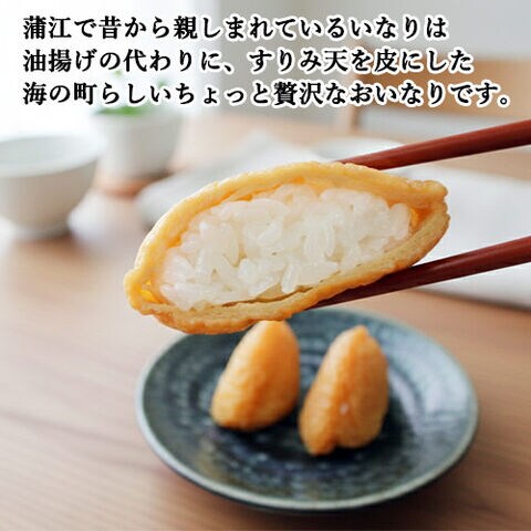 蒲江で昔から親しまれているいなりは油揚げの代わりに、すりみ天を皮にした、海の町らしいちょっと贅沢なおいなりです。