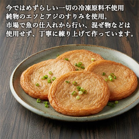 今ではめずらしい一切の冷凍原料不使用、純物のエソとアジのすりみを使用。市場で魚の仕入れから行い、混ぜ物などは使用せず、丁寧に練り上げてつくっています。