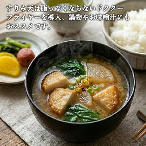 すりみ天を揚げる時は、脂っぽくならないドクターフライヤーを導入。おいしさを損なわないよう、最新の冷凍技術(3Dフリーザー)にて凍結しております。 鍋物やお味噌汁にいかがでしょうか?