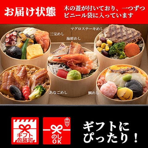 | 内容量 | あなごめし1個・鯛めし1個・海鮮めし1個・まぐろステーキめし1個・三宝めし1個 |