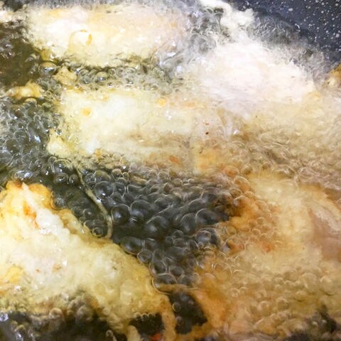 鶏肉には下味がついていますので、特製のてんぷら粉を水で溶いて、鶏肉をくぐらせてから油で揚げるだけ。