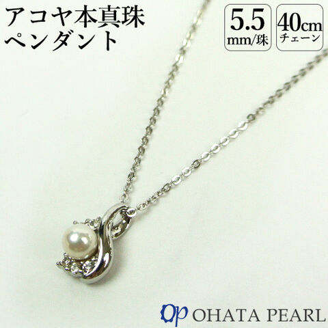 国産アコヤ真珠 5.5ミリ珠&透明石 小ぶりペンダント(金具 代用ロジウム チェーン長さ約40cm ガラス) 本真珠 ジュエリー シンプル オーハタパール【ギフト可】【送料無料】