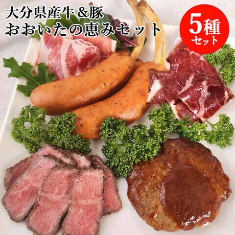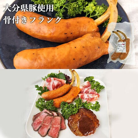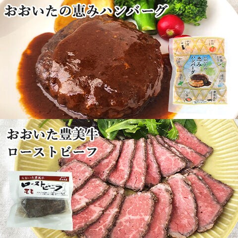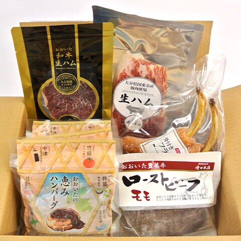 ・おおいたの恵みハンバーグ160g×4個 ・おおいた和牛生ハム50g×1パック ・大分県産豚生ハム60g×1パック ・おおいた豊美牛ローストビーフ150g×1個 ・大分県産豚使用骨付きフランク100g×1パック(2本入) |