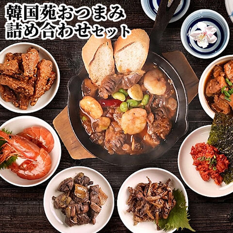 宴ボックス おつまみセット 計7種類(甘辛親鳥皮炭火焼/親鳥もも炭火焼/牛ホルモン炭火焼/凍手羽/カンジャンセウ/チャンジャ/砂肝アヒージョ) 化粧箱入り 冷凍 韓国苑【送料込】