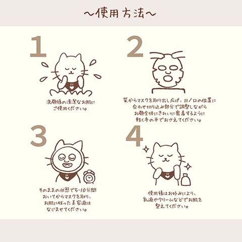 - 洗顔後の清潔なお肌にご使用ください。 - 袋からマスクを取り出し広げ、目/口の位置に合わせ切り込み部分で調節しながらお顔全体にきれいに密着するように軽く手の平でおさえてください。 - そのままの状態で5-10分間おいてからマスクを取り、お肌に残った美容液はなじませてください。 - 使用後はお好みにより、乳液やクリームなどでお肌を整えてください。 |