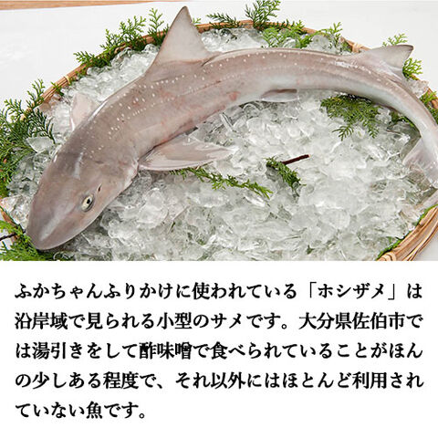 | 原料 | ひじきふりかけ(ひじき(国内産)、果糖ぶどう糖液糖、食塩、ごま、かつお節エキス、酵母エキス)(大分県製造)、ホシザメ(大分県産)、ごま、本醸造醬油(大豆、小麦を含む)、砂糖、椎茸、生姜/香料 |