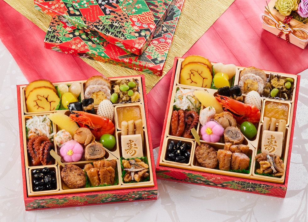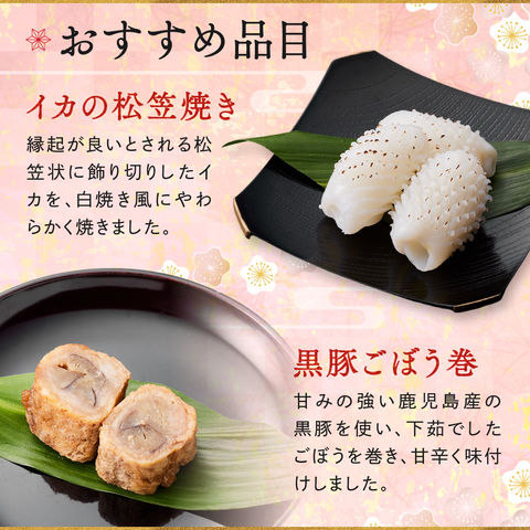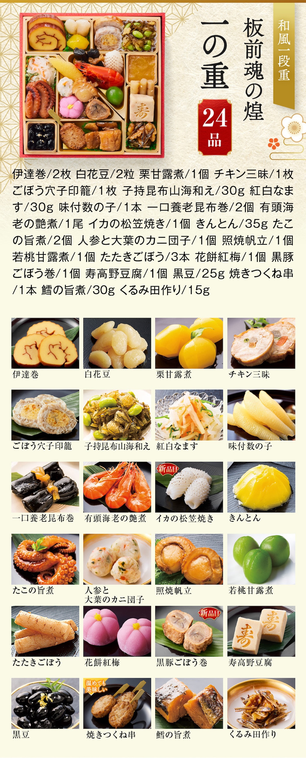 【一の重】伊達巻/白花豆/栗甘露煮/チキン三昧/ごぼう穴子印籠/子持昆布山海和え/紅白なます/味付数の子/一口養老昆布巻/有頭海老の艶煮/イカの松笠焼き/きんとん/たこの旨煮/人参と大葉のカニ団子/照焼帆立/若桃甘露煮/たたきごぼう/花餅紅梅/黒豚ごぼう巻/寿高野豆腐/黒豆/焼きつくね串/鱈の旨煮/くるみ田作り